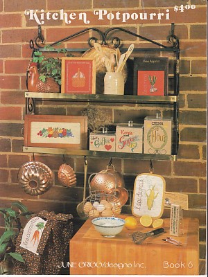 16 designs - Recipe For Living, Corn, Carrots, Onions, Green Pepper, Turnip, Green Peas, Fruit Bounty, This Kitchen Closed - Self Servvice Only, Egg Basket, Strawberries, Vegetable Medley, Flour Cannister - Crown Flour, Sugar Cannister - Kanes Sweet Sugar, Coffee Cannister - Heart's Coffee, Whats Cookin Bookmark