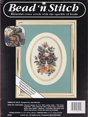 Wings of Gold - New - Beaded Butterfly in Autumn Flowers - Beige 14ct fabric, floss, needles, Assorted Beads, chart & instructions - 5" x 7"