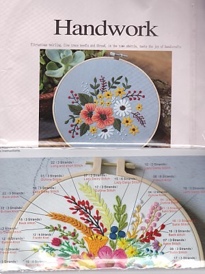 4 designs - New - Opened - Quiet / Daisies in Spring / Summer Flowers / Poppies in Winter - Pre-Stamped Fabric, floss, needles, 2 Hoops & instructions - each 7.75"