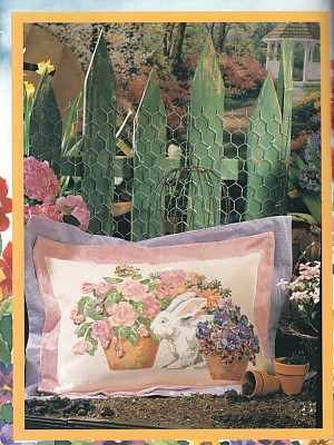 8 designs- A Rabbit in the Garden / Basket of Pansies / Ivy Border, Angel of the Nursery / Baby Bassinet & Toys, To Every Season Sampler / To Everything is a Season / Trees / Mountains / Night Sky, Noah's Ark & Animals / Girrafe Lions Sheep Scene, Cat in a Window / Window & Potted Flowers / Cat on Table, Love Is All Around / Floral Heart Pillow / Wedding Sampler, Robin in the Roses / Roses Pillow / Robin on Branch, Christmas Feast / Bowel of Fruits & Teapot / Bowl of Fruits Tea Cozy