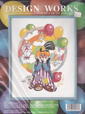Clown Dreams - Balloons Child & Dog - New - White 14ct fabric, floss, needle, chart & instructions - 196 x 210