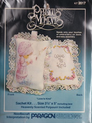 Love Is Kind Sachet Ornament Kit - Little Girl with Bird - New - Pre-Printed Colored fabric, floss, needle, Heavenky Scented Potpourri, White Lace, White Ribbon, chart & instructions - 3.5" x 5"