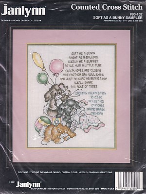 Soft As A Bunny Birth Sampler - New - Beige 27ct Linen fabric, floss, needle, chart & instructions - 324 x 378