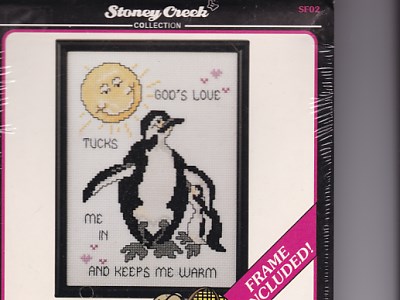 Penguin & Baby Penguin - God's Love Tucks me in and keeps me warm - New - White 14ct fabric, floss, needle, Black Plastic frame, chart & instructions - 5" x 7"