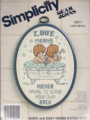 Love Means Never having to scrub your own Back - Husband & Wife in Bath Tub - New - Beige 14ct fabric, floss, needle, Blue Oval Frame, chart & instuctions - 5" x 7"