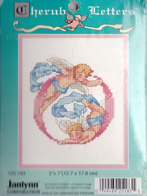 O - Two Flying Cherubs with Pink Ribbons Letter - New - White 28ct linen fabric, floss, needle, chart & insturctions - 140 x 196