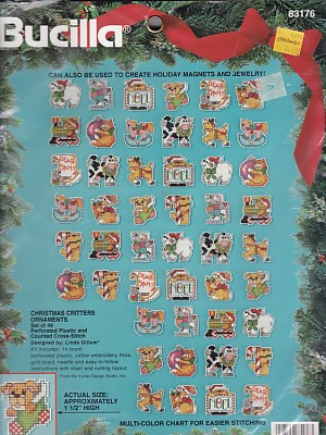48 designs - Christmas Critters Ornaments - New - Cute Cutesy Animals - Preforated Plastic 14ct, floss, needle, Gold Braid, chart & instructions - 21" x 22" ornament each