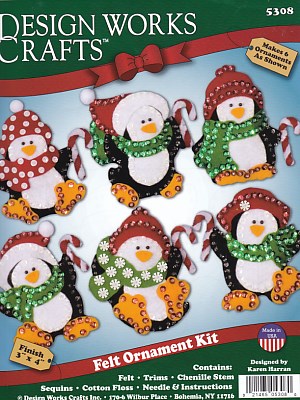 6 Penguin Designs Ornaments - New - Felt, Trims, Chenille Stem, Squins, Floss, Needle, chart & instructions - 3" x 3" each