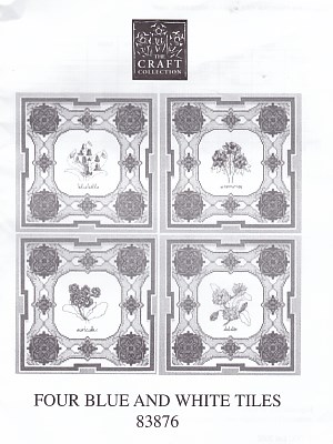 4 designs - Blue & White Tiles - New - Flowers - Auriculas / Daisies / Primrose / Violet - White 16ct fabric, floss, needle, chart & instructions - each tile 96 x 96