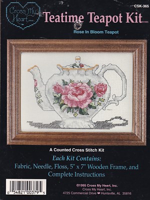 Rose in Bloom Teapot - New - White 14ct fabric, floss, needle, Wooden Frame, chart & instructions - 5" x 7"