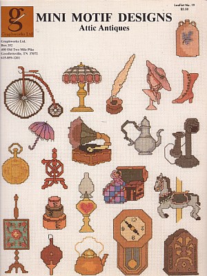 21 designs - Clock, Telephone, Carousel Horse, Shaker Boxes, Tiffany Lamp, Oil Lamp, Ink Well & Quill, High Bicycle, Fire Screen, Radio, Tea Pot, Silver Tea Server, Pocket Watch, Spinning Wheel, Victorola, Parasol, Trunk with Doll, Hat with Stand, Bellows, High-Button Shoe, Jug
