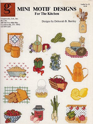 17 designs - Bag of Potatoes, Wine & Cheese, Lemons, Hot Peppers, Peach Jam, Bowl of Strawberries, Pickles, Tea Pot & Oranges, Apple Pie, Apple Basket, Egg Basket, Coffee Pot & Ivy, Oil Can, Green Onions, Crock of Kitchen Tools, Pots & Pans, Loaf Breads